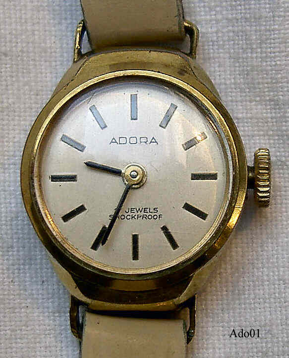 An Adora ladies handwind watch with goldplated case. Signed front: ”Adora, 17 Jewels, Shockproof, ”, back: ”ARA, 20 Micron, Fond Acier”, inside: ”HP 25”. gold plated case with fixed lugs for the band. Caliber Perennia 25.