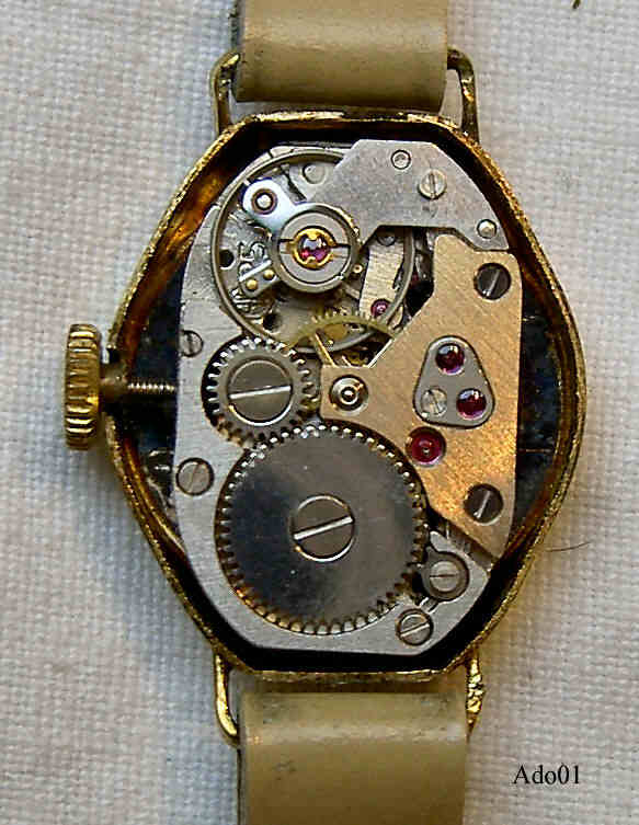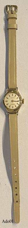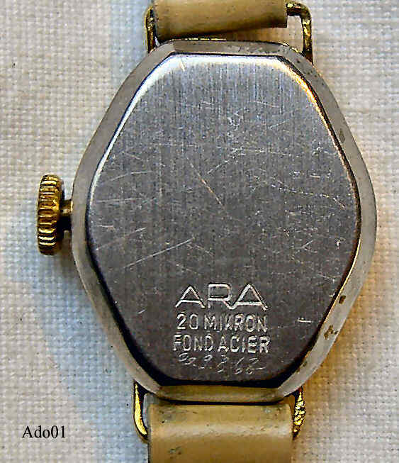 Dies ist eine Adora Damen Handaufzugs Uhr mit vergoldetem Gehäuse. Beschriftet vorn: ”Adora, 17 Jewels, Shockproof, ”, hinten: ”ARA, 20 Micron, Fond Acier”, innen: ”HP 25”. Gehäuse vergoldet mit festen Stegen für das Armband. Caliber Perennia 25.