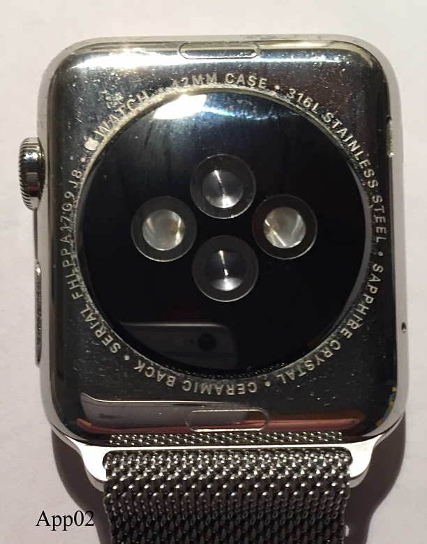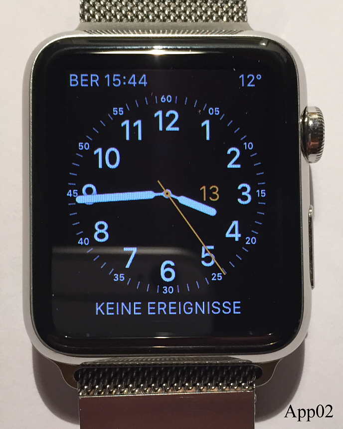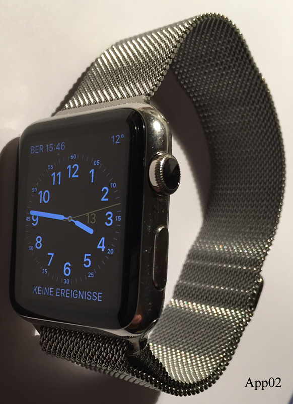 Die Apple Watch Serie 1 zur Bluetooth Koppelung mit iPhones. Die Uhr hat einige eigenständige Funktionen und funktioniert auch als Fernbedienung des iPhones. Der Accu wird über ein induktives magnetisches Ladegerät über die Rückseite geladen. Hier gekoppelt mit einem Apple iPhone 6. Die Bedienung erfolgt über den Touch screen der Uhr, die Uhranzeige wird über eine Handbewegung aktiviert. Genial auch das Milanaise Armband mit magnetischem Verschluß.