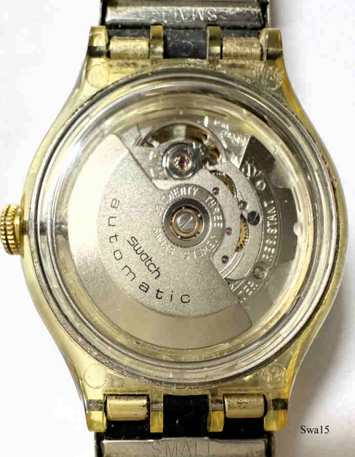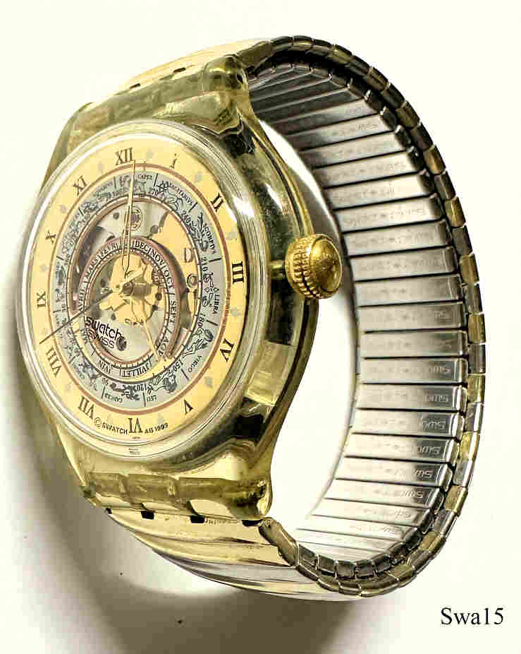 Eine Swatch Automatic Uhr im üblichen Kunststoff Gehäuse mit einem Sternzeichen Zifferblatt. Der äußere Ring hat römische Ziffern, der zweite Ring zeigt die Sternzeichen, der dritte Ring die Monate. Dieser Ring ist zwar fest aber exzentrisch angeordnet. Beschriftet vorn: “Swatch, Swiss”, innen: “Swatch, Automatic, Twenty Three Jewels, ETA 2842”. Goldfarbenes FixoFlex Armband