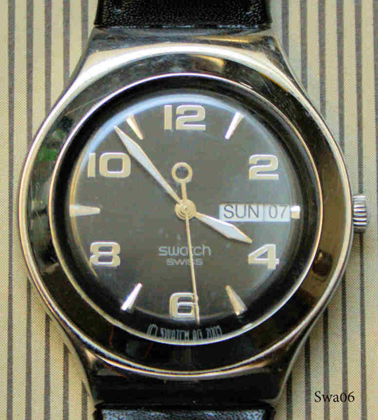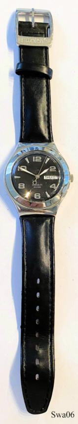 A Swatch Irony watch with Metal Case. Signed front: “Swatch, Swiss, Swatch AG 2005”, back: ”Swatch, Irony, Stainless Steel, Patented, Water Resistant, Swiss Made V8, Battery 397, SR 726 SW”. Black leather band. Day / Date at 3