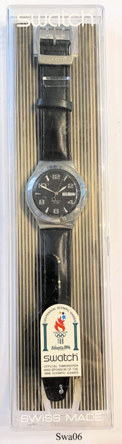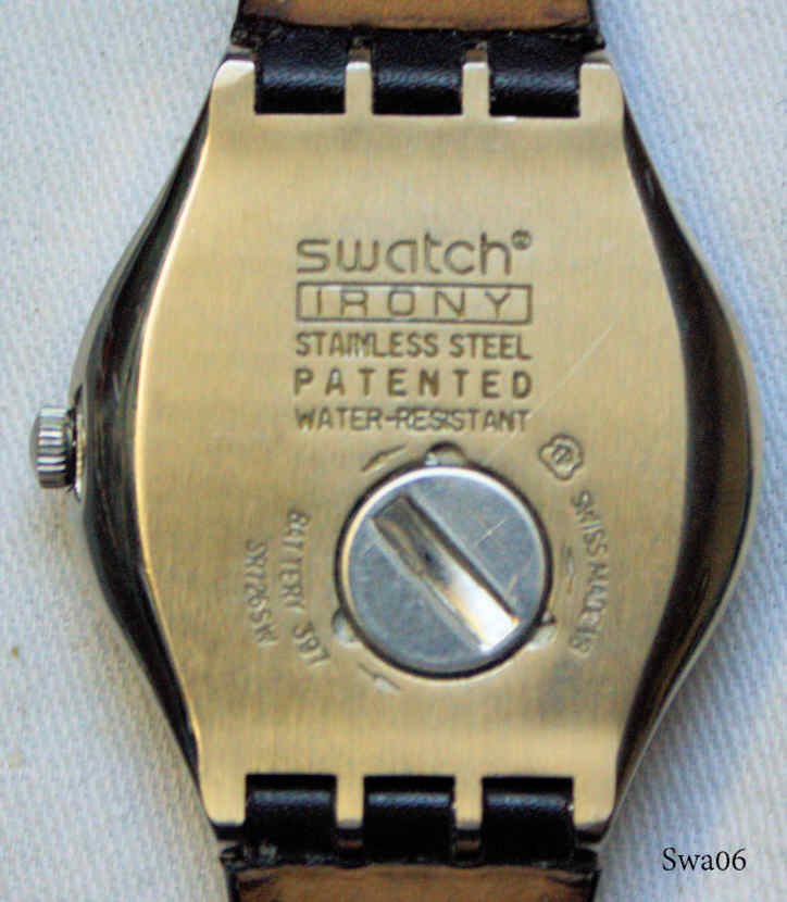 Eine Swatch Irony Uhr mit Metall Gehäuse. Beschriftet vorn: “Swatch, Swiss, Swatch AG 2005”, hinten: ”Swatch, Irony, Stainless Steel, Patented, Water Resistant, Swiss Made V8, Battery 397, SR 726 SW”. Schwarzes Leder Armband. Day / Date bei der 3