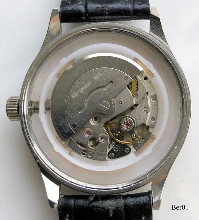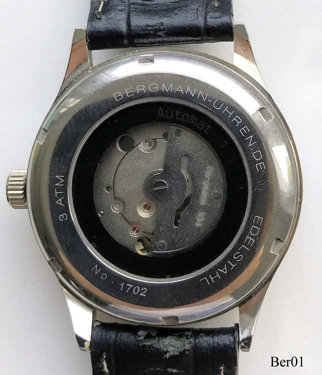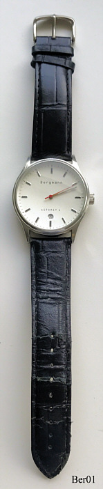 Dies ist eine Bergmann Automat1. Beschriftet: ”Bergmann, Automat1”, Rückseite: ”Edelstahl, Bergmann-Uhren.de, Nr.: 1702, 3 ATM”. Gehäuse Edelstahl, Hellgraues Zifferblatt, Datum bei der 6, Schwarzes Lederarmband. Kaliber Bergmann 411.