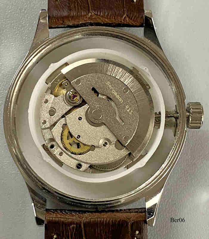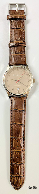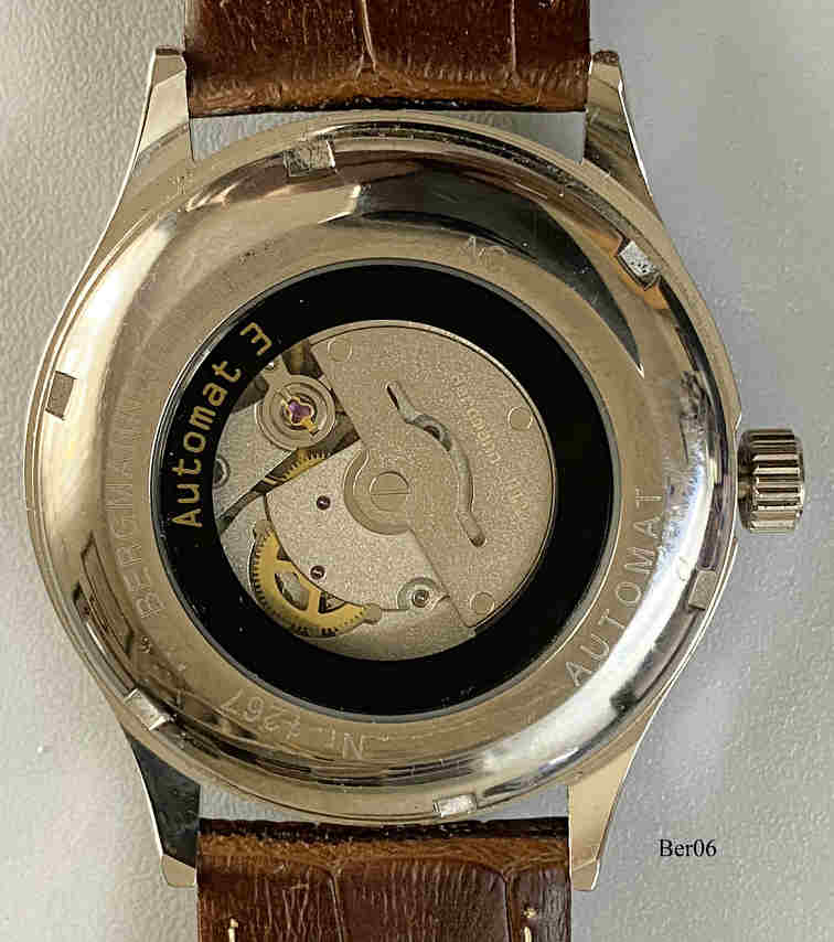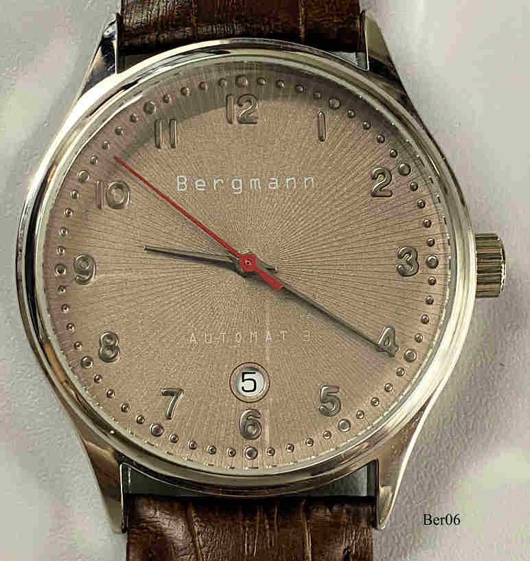 Dies ist eine Bergmann Automat 3, Datum bei der 6, Nr. 1267,. beschriftet vorn: “Bergmann, Automat 3”, hinten: “Automat, Nr. 1267, Bergmann-Uhren.de, AC, Automat 3”, innen: ”Bergmann 411”. Gehäuse Edelstahl, Glasboden, hellbraunes Zifferblatt, braunes Lederarmband. Kaliber unbekannt.