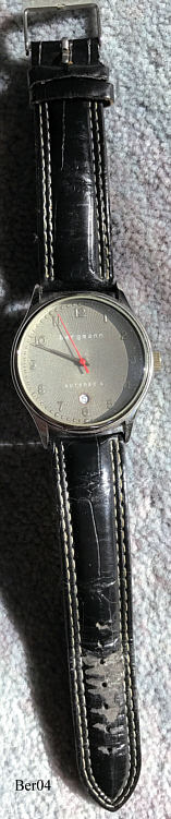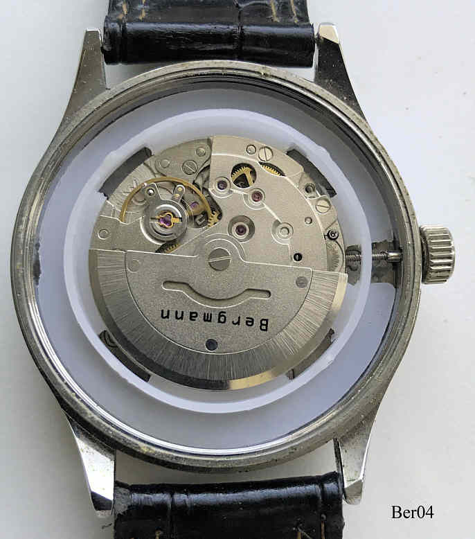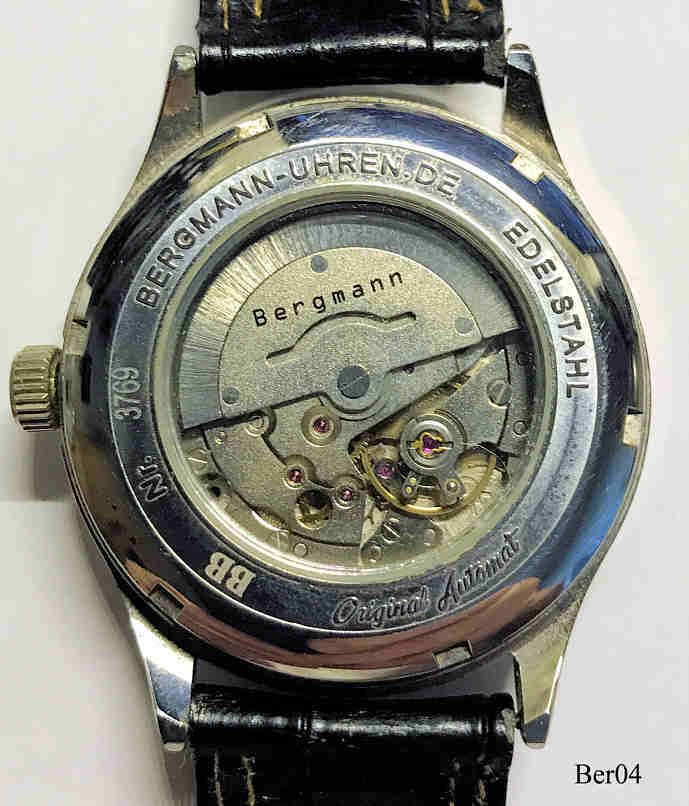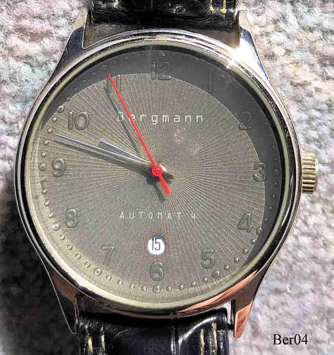 Dies ist eine Bergmann Automat4, beschriftet: ”Bergmann, Automat4”, Rückseite: ”Edelstahl, Bergmann-Uhren.de, Nr.: 3769, BB, Original Automat”. Gehäuse Edelstahl, Dunkelgraues Zifferblatt, Datum bei der 6, Schwarzes Lederarmband. Kaliber unbekannt.