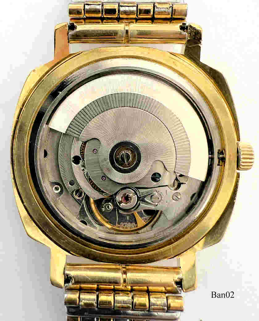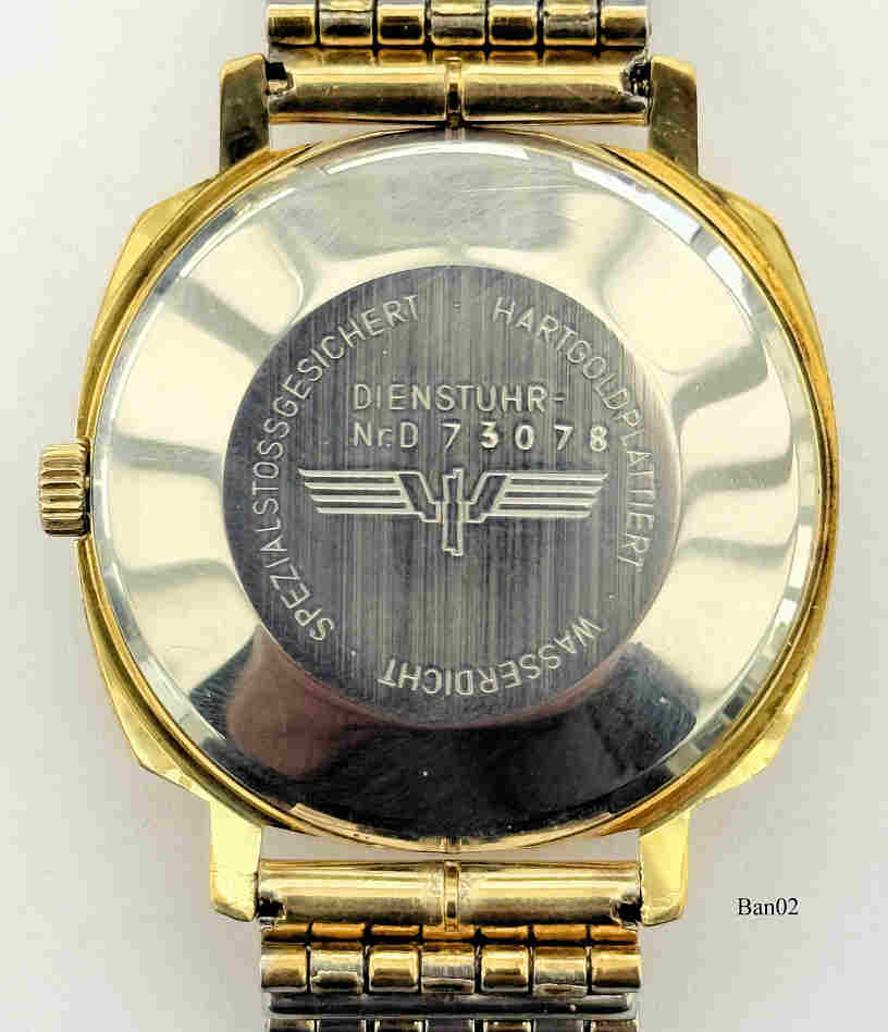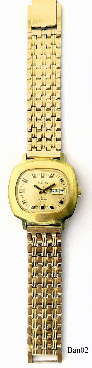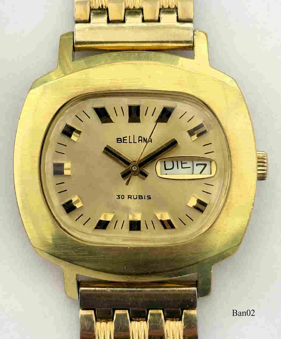Eine Bellana Automaticuhr als Dienstuhr der Deutschen Bahn mit der Dienstuhr Nummer D73078, das Werk ist ein ETA 2789. mit 30 Steinen und Day/Date bei der 3. Base Metal Gehäuse und Edelstahl Rückwand. Inschrift vorn: ”Bellana, 30 Rubis”, hinten: ”Spezialstoßgesichert, Hartgoldplattiert, Wasserdicht, Dienstuhr Nr.: D 73078””, innen: “ETA 2789.,Vergoldetes Gliederarmband