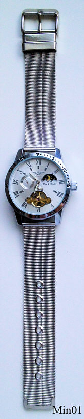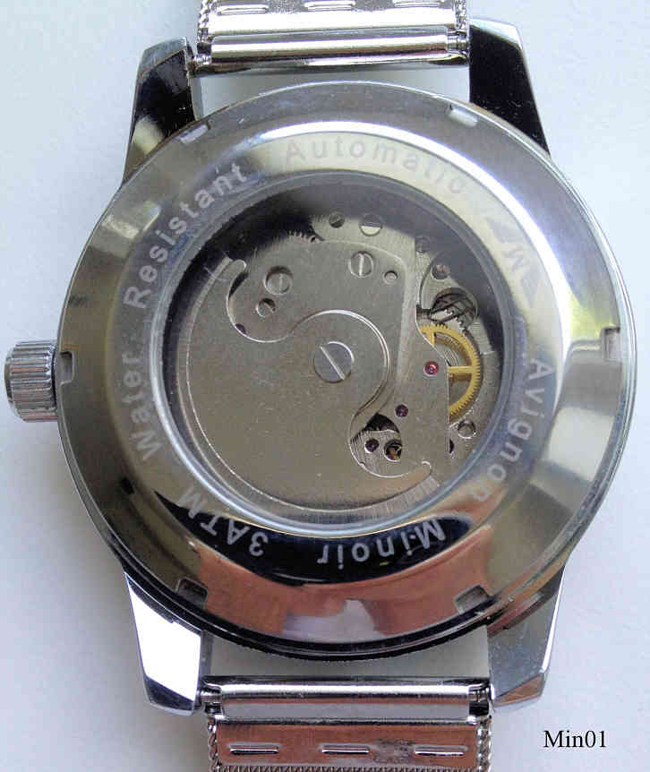 Diese Automatic Uhr von Minoir, Modell Avignon, hat einen Glasboden, ein Automatic Werk und ein interessantes Zifferblatt. Es gibt eine Anzeige für Tag/Nacht, eine Anzeige für GMT sowie eine Sekundenanzeige und die offene Unruhe. Großes Edelstahl Gehäuse. Beschriftung vorn: ”Minoir, Day & Night”, hinten: ”3ATM Water Resistant, Automatic, Avignon, Minoir”. Milanaise Armband
