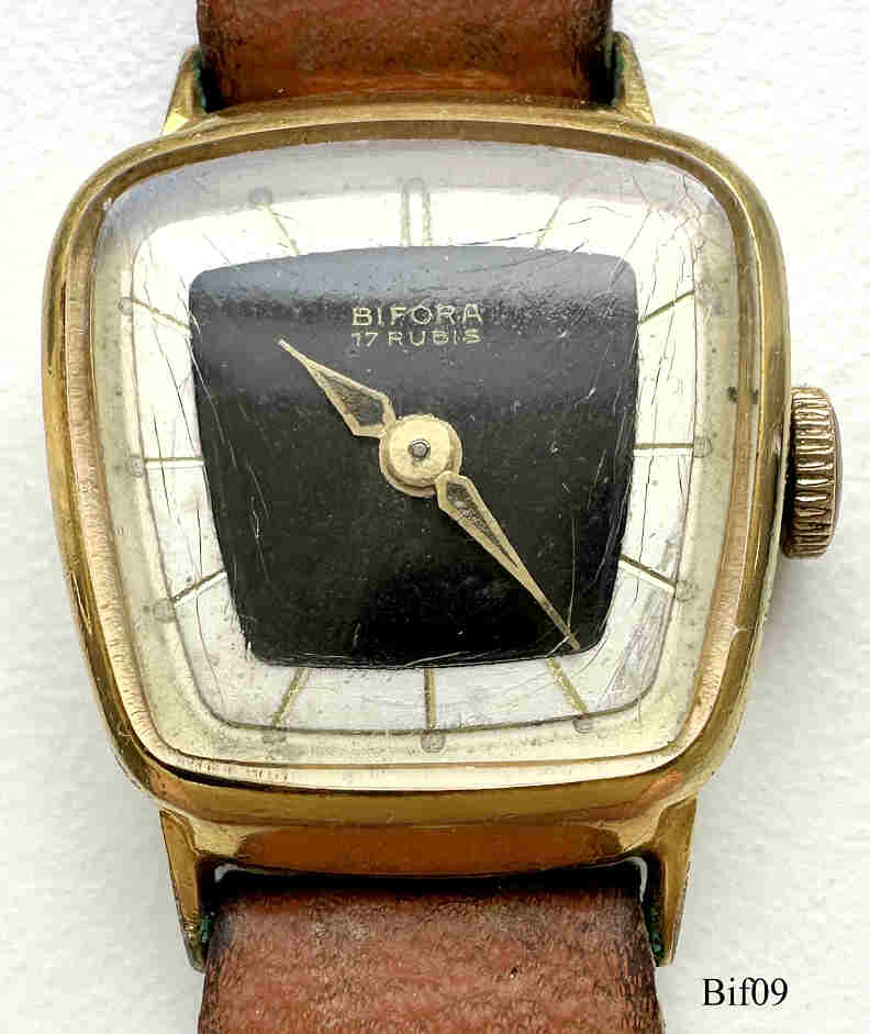 A Bifora ladies handwind watch with the Bifora 55 caliber. Signed front: ”BIFORA, 17 Rubies”, back: ”20 Microns, Stainless Steel Back”, inside: “55”. Caliber: Bifora 55, brown leather band.
