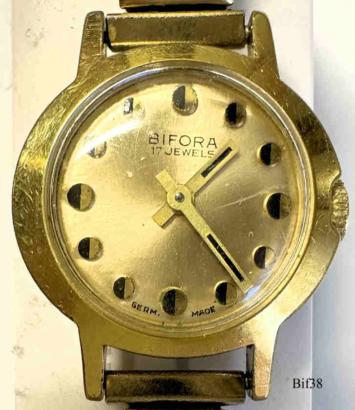 Dies ist eine Bifora Handaufzugs Uhr mit dem Bifora 691 Werk, Modell “Day/Night”. Beschriftet vorn: ”BIFORA, 17 Juwels, Germ. Made”, hinten: “Stainless Steel Back”, innen: “€¯B, 691”, Kaliber: Bifora 691, FixoFlex Band. Die Bezeichnng Day/Night bezieht sich auf die Punkte auf dem Zifferblatt.