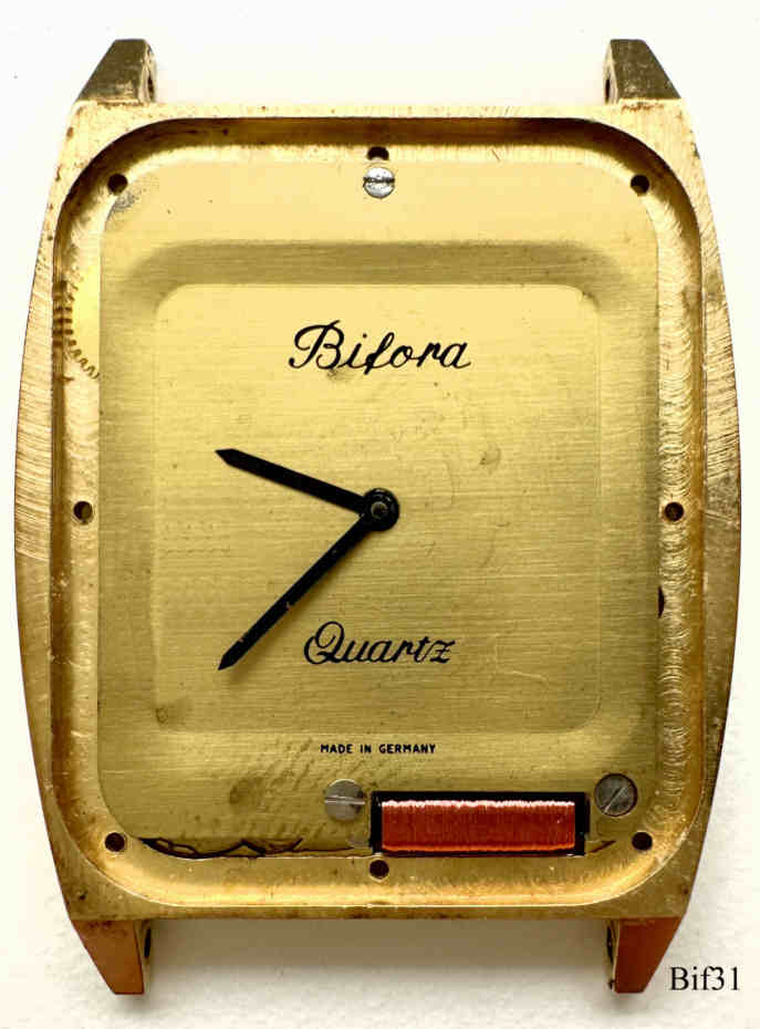 Dies ist eine Bifora Quartz Uhr mit dem Slim Line Werk B17, der Stellknopf ist an der Rückseite. Die Uhr hat ein sehr ansprechendes vergoldetes Gehäuse und ist  3,2mm dick. Beschriftet vorn: ”BIFORA, Quartz, Made in Germany”, hinten: ”Bifora, Made in W. Germany, Stainless Steel Back, Base Metal Gold Plated”, innen: “B, Two 2 Jewels, Unadjusted, W. Germany”.  Kaliber: Bifora B17.
