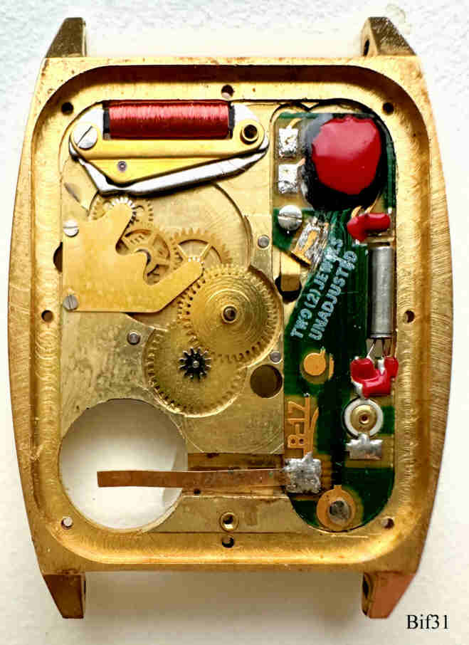 This is a Bifora quartz watch, using the slim-line movement B17 of Bifora,  the alignment is at the back. The watch has a very attractive golden case, and is 3,2mm thick. Signed front: ” BIFORA, Quartz, Made in Germany”, back: ”Bifora, Made in W. Germany, Stainless Steel Back, Base Metal Gold Plated”, inside: “B, Two Jewels, Unadjusted, W.Germany”  Caliber: Bifora B17.