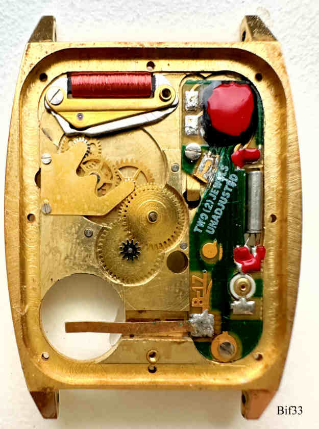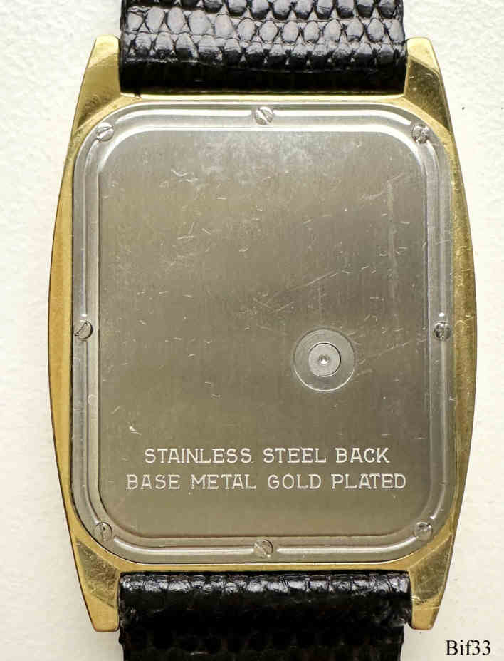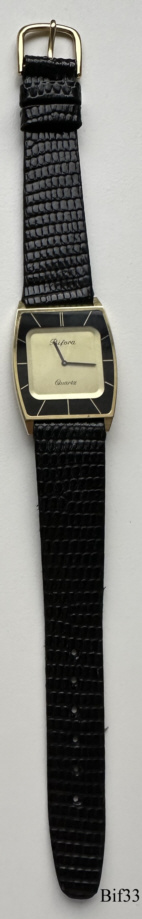This is a Bifora quartz watch, using the slim-line movement B17 of Bifora, the alignment is at the back. The watch has a very attractive golden case, and is 3,2mm thick. Signed front: ” BIFORA, Quartz”, back: ”Stainless Steel Back, Base Metal Gold Plated”, inside: “B, Two Jewels, Unadjusted, W.Germany” Caliber: Bifora B17.