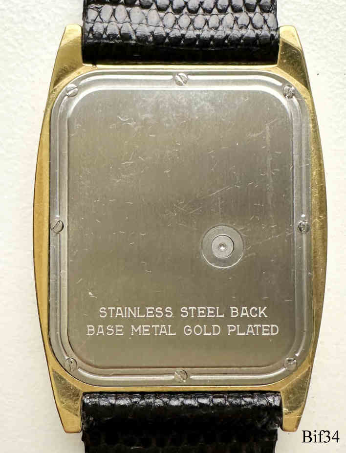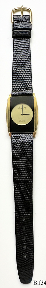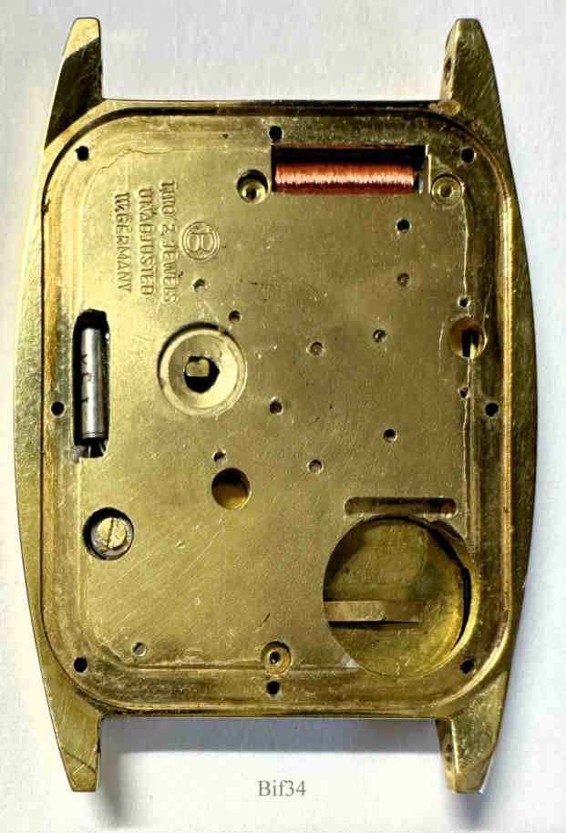 This is a Bifora quartz watch, using the slim-line movement B17 of Bifora,  the alignment is at the back. The watch has a very attractive golden case, and is 3,2mm thick. Signed front: ” BIFORA, Quartz”, back: ”Stainless Steel Back, Base Metal Gold Plated”, inside: “B, Two Jewels, Unadjusted, W.Germany”  Caliber: Bifora B17.