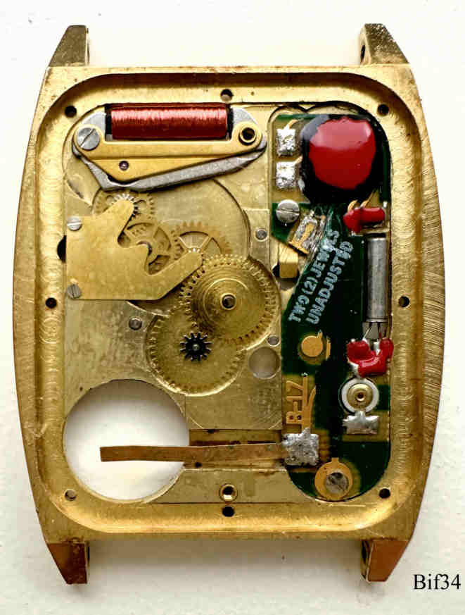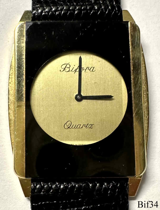 Dies ist eine Bifora Quartz Uhr mit dem Slim Line Werk B17, der Stellknopf ist an der Rückseite. Die Uhr hat ein sehr ansprechendes vergoldetes Gehäuse und ist  3,2mm dick. Beschriftet vorn: ”BIFORA, Quartz”, hinten: ”Stainless Steel Back, Base Metal Gold Plated”, innen: “B, Two 2 Jewels, Unadjusted, W. Germany”.  Kaliber: Bifora B17.