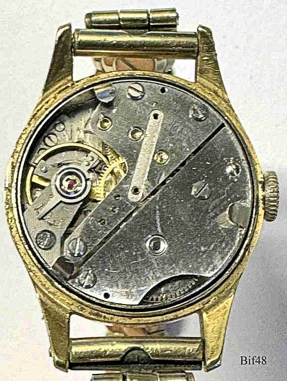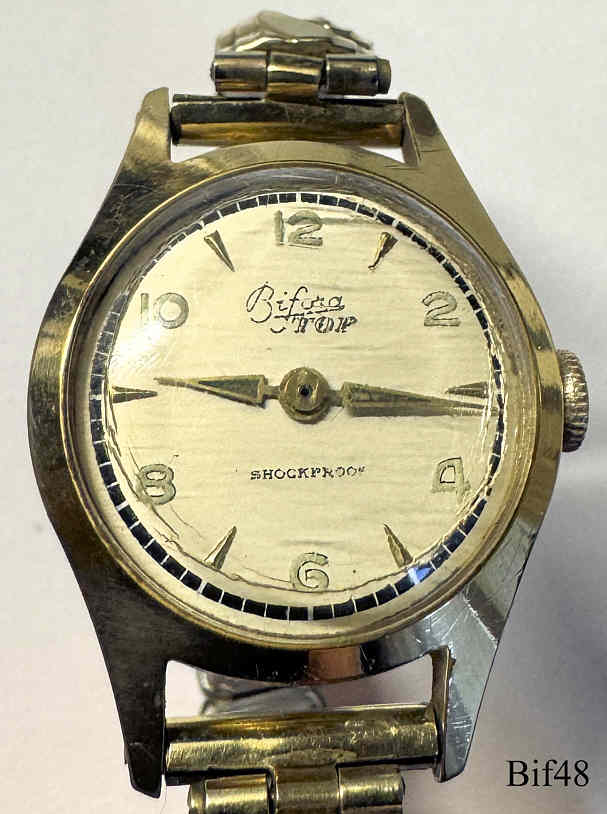 Dies ist eine Bifora Handaufzugs Uhr mit dem Bifora 934 Werk, an den Zeitgeschmack angepasst durch eine Zentral Sekunde. Dafür wurde die Kaliber Bezeichnung durch ein SC modifiziert. Beschriftet vorn: ”¯BIFORA, Top, Shockproof”, hinten: ”Stainless Steel Back”, innen: ”¯B, 934 SC”,¯ Kaliber: Bifora 934 SC, 1-61 Elasta-Luxus Armband