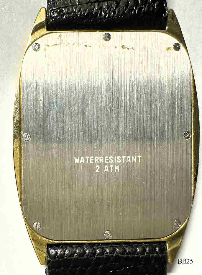 This is a Bifora quartz watch, using the slim-line movement B18 of Bifora. At the market placement it was the slimmest watch in the world with 3,0mm.. This B18 movement is a separate one, the alignment is at the side. The watch has a very attractive golden case. Signed front: ” BIFORA, Quartz” back:”Two Jewels, Unadjusted, W. Germany, B”, Caliber: Bifora B18”,