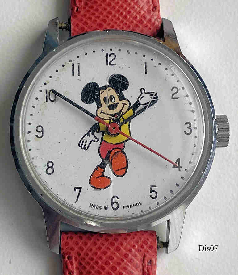 Eine Walt Disney Unisex Uhr im Mickey Design. Diese Uhr wurde in Frankreich (für Disneyland Paris?) hergestellt. Beschriftet vorn: “Made in France”, hinten: “Stainless Steel Back, Antimagnetic, c. Walt Disney Product, Avronel”, innen: “Cattin Co., France, Unadjusted, 1 Jewel”, Kaliber Cattin C66