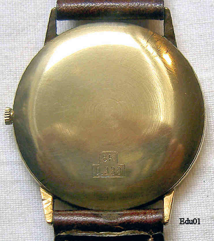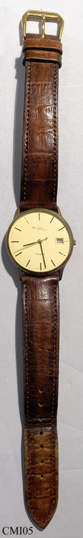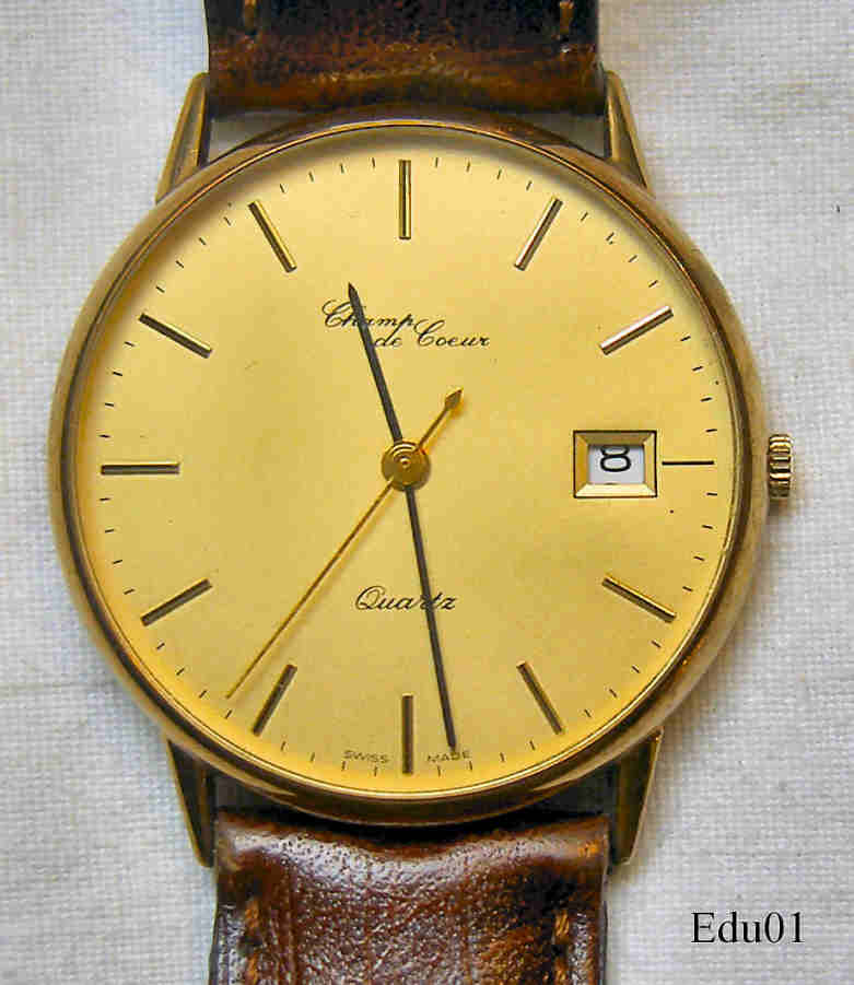 A very nice, flat quartz watch of the label “Champ de Coeur”, sold by Eduscho. Goldtone dial and brown leather band. Signed front: ”Champ de Coeur, Quartz, Swiss Made”, back: ”8K, 0,333”, inside: ”No Jewels, Harley Ronda, 3775”. Caliber Harley Ronda 3775.