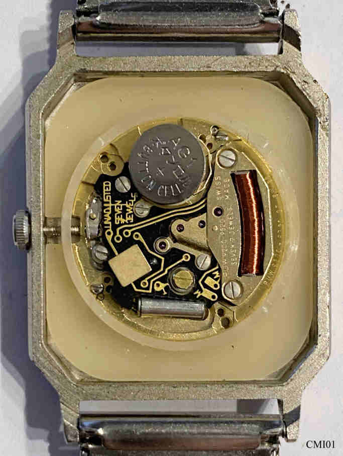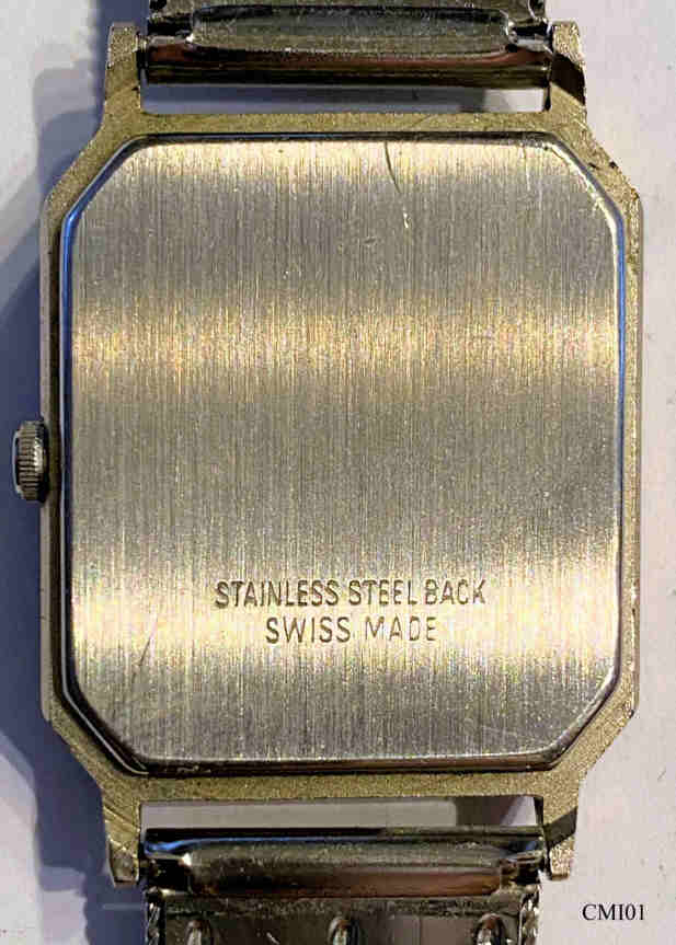 Eine superflache CMI Armbanduhr mit Edelstahlgehäuse und einem sehr attraktiven, schachbrettartig geschliffenem Zifferblatt, Beschriftet vorn: “CMI, Quartz, Swiss Made”, hinten: “Stainless Steel Back, Swiss Made”, innen: “PUW 9200 9320, Unadjusted, Seven 7 Jewels, Swiss Made”, Edelstahl Milanaise Armband.