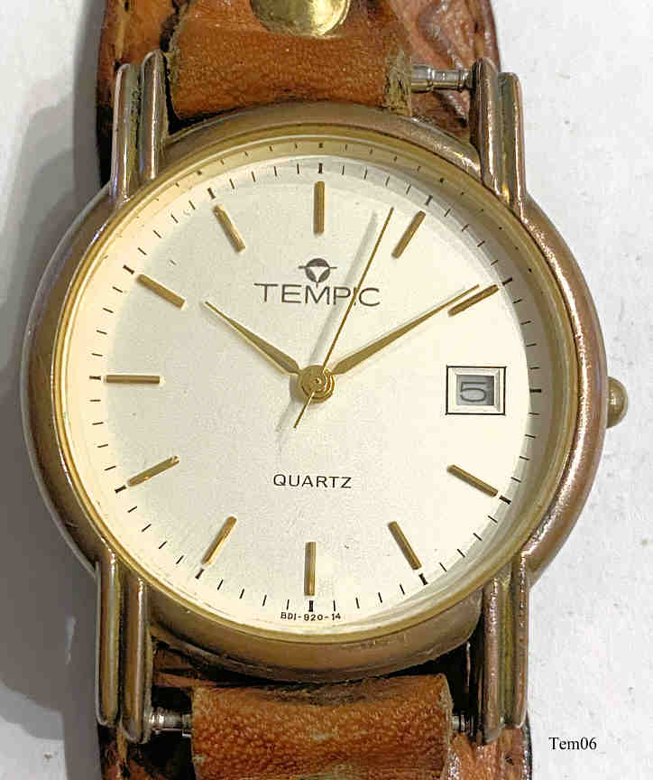 This is a ladies watch from Tempic in country designl. Signed front: “Tempic, Quartz”, back: ”Base Metal Bezel, Stainless Steel Back, Tempic, 01”, inside: ”Unadjusted, Miyota Co., Japan, One 1 Jewels””