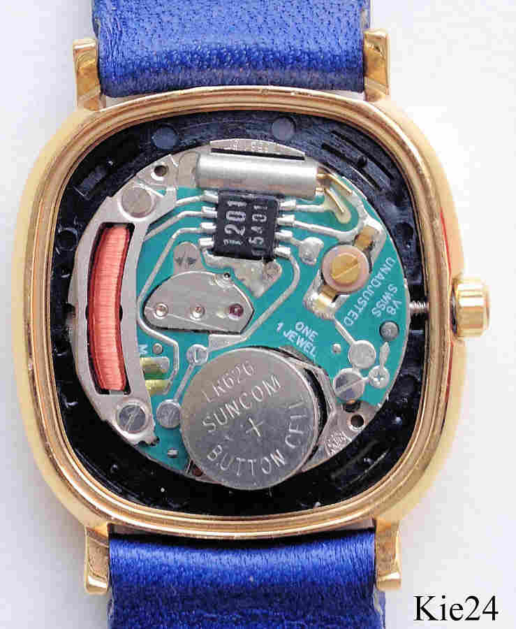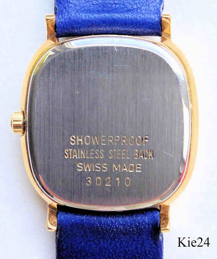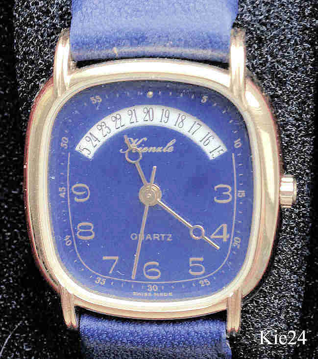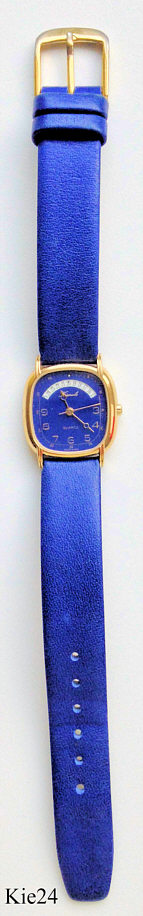 Dies ist eine Damen Schmuckuhr von Kienzle. Beschriftet vorn: ”Kienzle, Quartz”, Rückseite: ”Showerproof, Stainless Steel Back, Swiss Made, 30210”, innen: “ETA, 556.115, V8, Swiss, Unadjusted”. Gehäuse Base Metall, blaues Lederarmband. Kaliber ETA 556.115, blaues Zifferblatt, weiße Kalenderscheibe von 10 bis 2.
