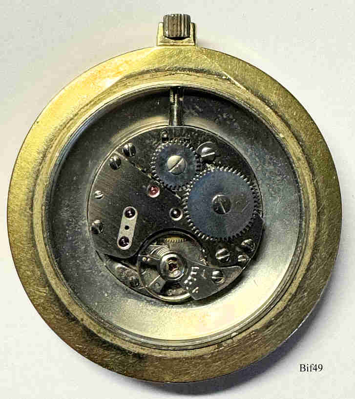 A Bifora ladies pcket clock with the caliber Bifora 91/1. Signed front: ”Bifora”, back: “ “, inside: ”B, 91/1”. Base metal case, 20 µ gold plated. |