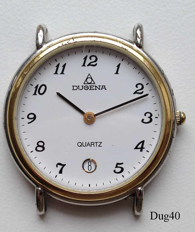 A Dugena mens watch with white dial and small Gold rim, Calendar at 3, base metal case. Signed front: “Dugena, Quartz”, back: ”Waterresistant, Stainless Steel back, 1145762, 1907, 955 414”, inside: ”Swiss Parts, seven 7 Jewels, Assembled in Thailand, ETA 955,414” |