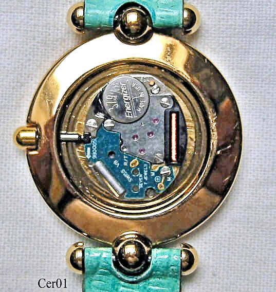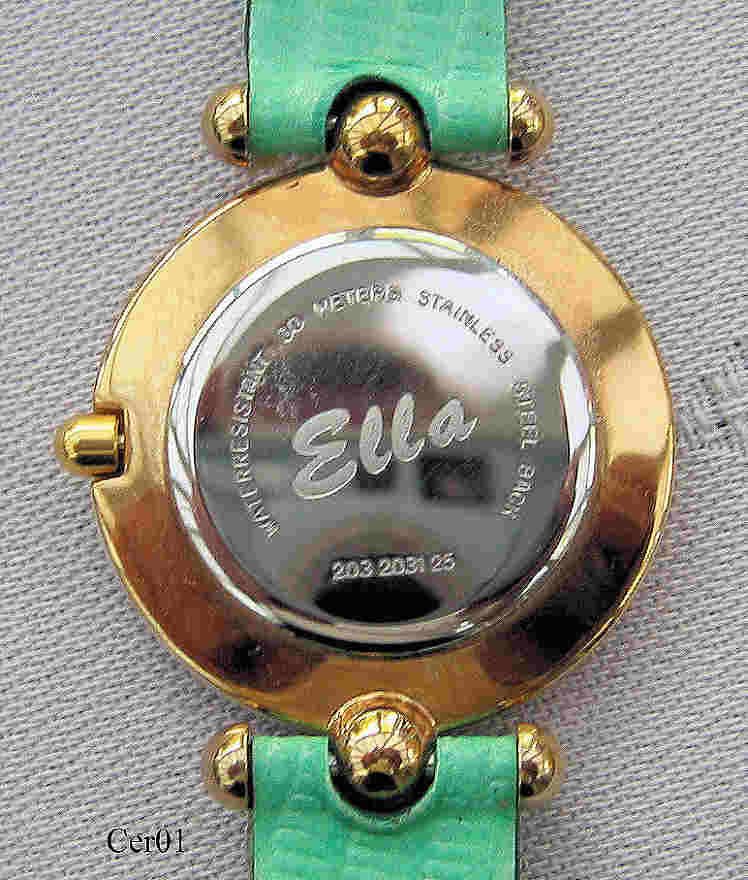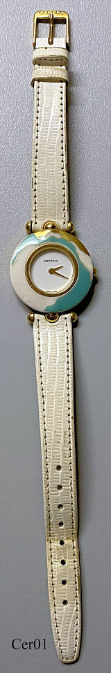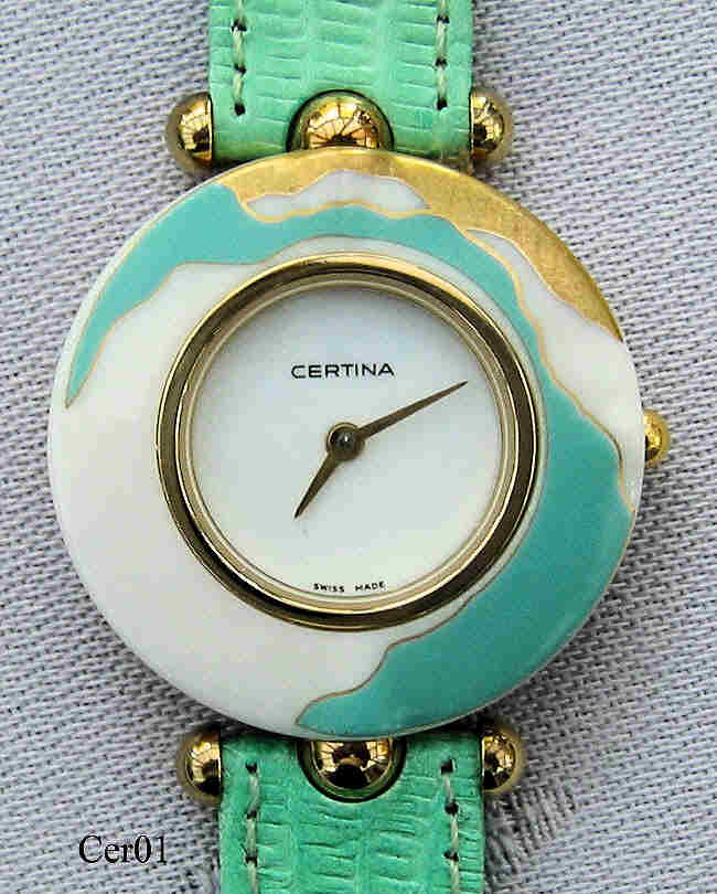 A Certina “Ella” ladies Dress watch with gold plated case and green/gold handpainted Rosenthal porcelain ring. The band is exchangeable in colors blue, green, white, orange and black. The dial is also made of porcelain, the back is stainless steel. Signed front: ”Certina, Swiss Made”, back: ”Waterresistant 30 meters, Ella, Stainless Steel back, 203 2031 25”. Caliber ETA 980.002