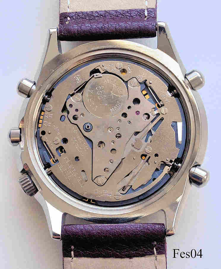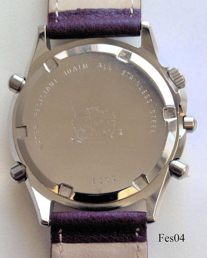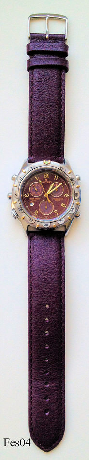 Ein Chronograph von Festina mit bordeaux rotem Zifferblatt und drei Chronographenskalen im selben rot. Beschriftet: “Festina, Alarm Chronograph, Water Resist 100M”, hinten: ”Festina, Water Resistant 10 ATM, All Stainless Steel, 6202”, innen: “Miyota Co., No Jewels, 3S10, Japan”. Datum bei der 4, bordeauxrotes Lederarmband.