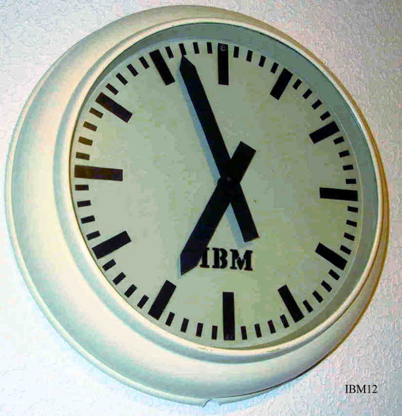 This is the movement from the IBM factory clock. It is controlled by a motherclock, that provides 24V direct current minute impulses of changing polarity. Hereby the minute hand is advanced always by one minute