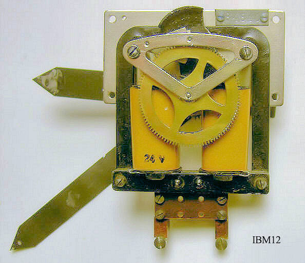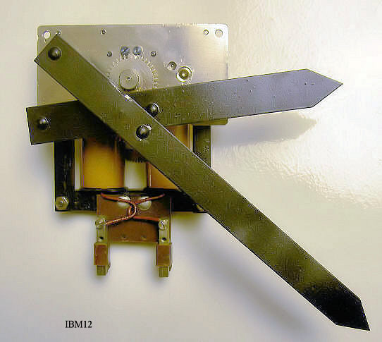 Dies ist das Uhrwerk aus der IBM Fabrikuhr. Es wird durch eine Mutteruhr gesteuert, indem es 24 V Gleichspannungs Minutenimpulse von abwechselnder Polarität erhält. Dadurch wird der Minutenzeiger jeweils um eine Minute vorgestellt.
