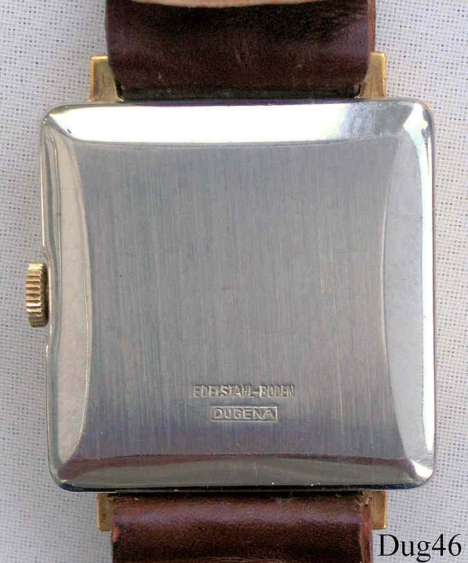 A Dugena Festa handwind watch with gold plated case and stainless back. Caliber Dugena 985, Signed front: “ Dugena, Festa” back: ”Edelstahl-Boden, DUGENA”, inside: ”Dugena, 985”. Brown leather band with neutral clasp.