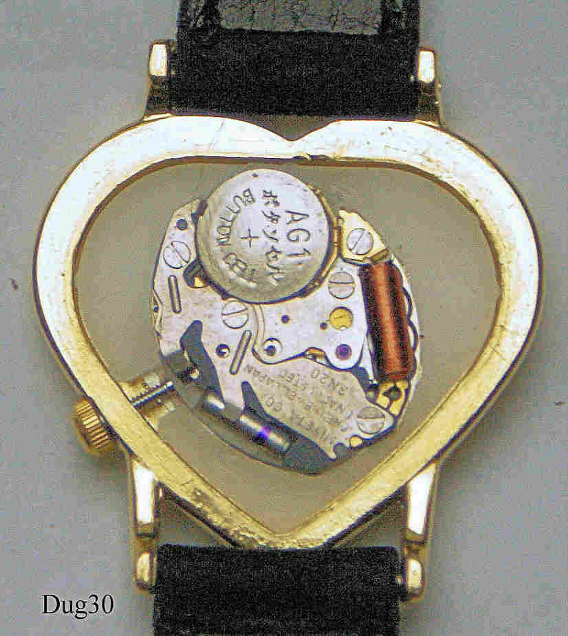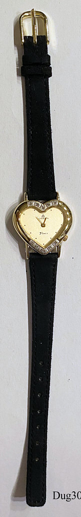 A Dugena Flair Ladies Quartz watch with heart shaped case, zirkonia applications and Stainless Steel Back. Signed front: “ Dugena, Flair” back:” Stainless Steel Back, 711656, 42”, inside:”Miyota Co., One 1 Jewel, Japan, Unadjusted, 3N20”. Black Band with velvet look.