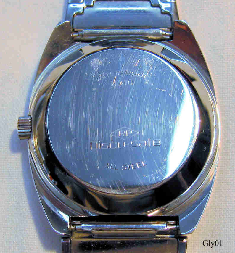 A Glycine Quartz, one of the early analogue quartz watches. ETA movement Caliber 9182, date at 3. Signed front: “Glycine, Quartz, Swiss Made”, back: “Waterproof, 4 ATÜ, RF, Discu Safe, All Steel”, inside: “Seven 7 Jewels, Swiss, Y2, ETA 9182”. Stainless Steel band.
