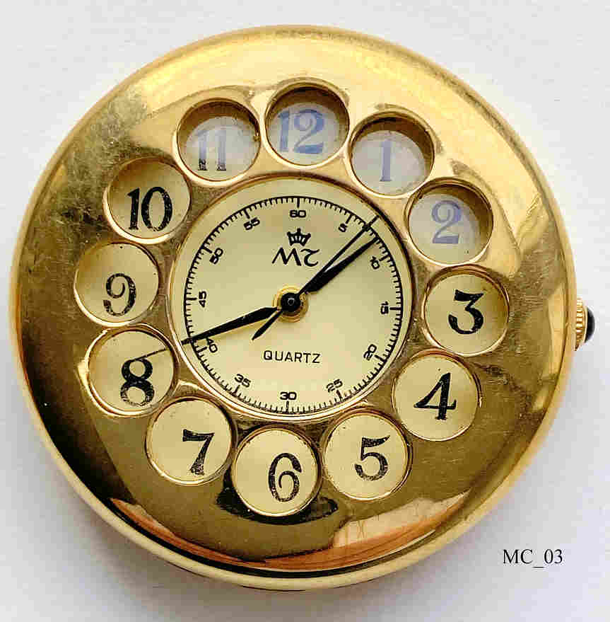A very nicequartz watch with metal covered dial of brand MC. In the outer ring the hours are noted, in the inner ring the minutes. Signed front: “MC, Quartz”, inside: ”Unadjusted, FE, 6120-30, 1 One Jewel”, back: “ ”.