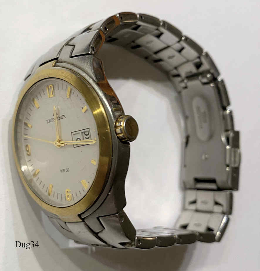 Eine Dugena Herren Quartzuhr mit bicolor Gehäuse und Stainless Steel Back. Besonderheit: Extra großes Datumsfenster bei der 3. Caliber IM50. Beschriftung vorn: “Dugena, WR50”, Hinten: ”2170912,1907,509, 52521, Stainless Steel, 5 ATM, Water Resistant”, innen: ”Ronda, 1 Jewel”. Edelstahl Armband mit Dugena Faltschließe.