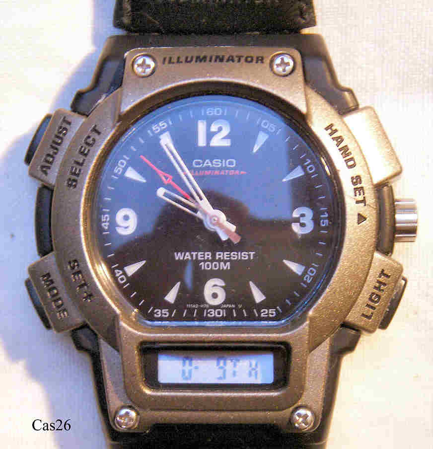 Ein moderner Ana/Digi Chronograph von Casio. Kunststoff Gehäuse mit Edelstahl Gliederarmband, schwarzes Zifferblatt, Digitalanzeige unter der 6. Beschriftet vorn: ”Casio, Illuminator,Water Resistant 100m”, innen: ”Casio, China”, hinten: ”Casio, 2315 AQ 150W, Stainless Steel Back, Water Resistant 10 Bar, Japan Mov’t Y, Cased in Thailand”.