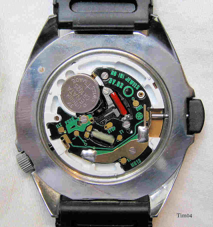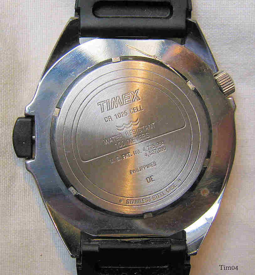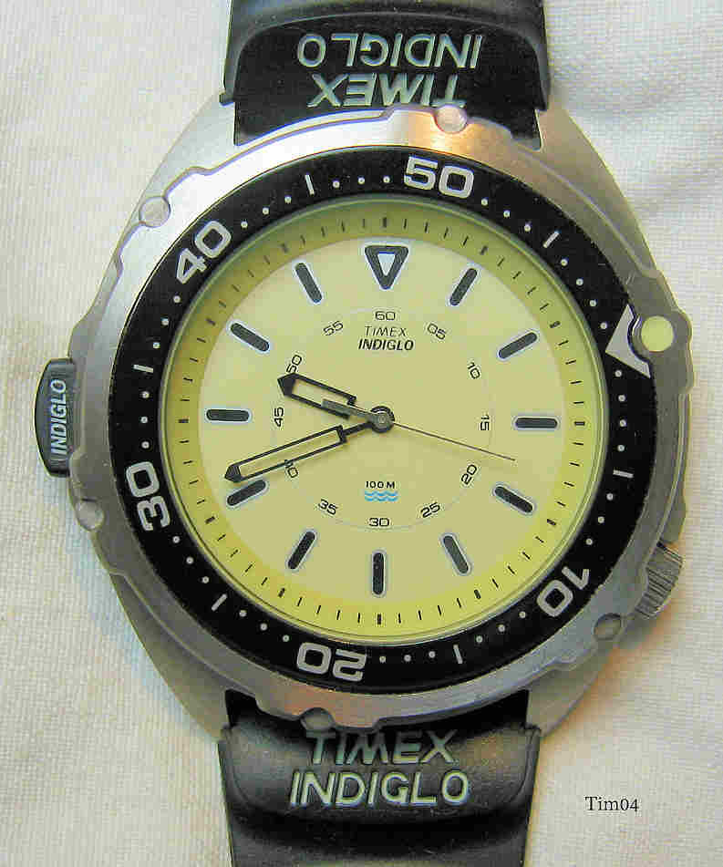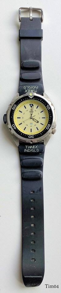Dies ist eine Timex Indiglo Uhr im Taucherdesign. Beschriftet: ”Timex, Indiglo, 100m”. Auf der Rückseite: ”Timex, CR1025 Cell, Water Resistant 100 Meters, US Pat. No. 4.775.864, 4.527.096, Phillipines, DE, Stainless Steel Case”. Innen: ”No (0) Jewels , 3V. 02, M613”. Verschraubte Krone, bei Druck auf den schwarzen “Indiglo” Knopf leuchtet das ganze Zifferblatt grün auf und ist damit im Dunkeln sehr gut abzulesen.