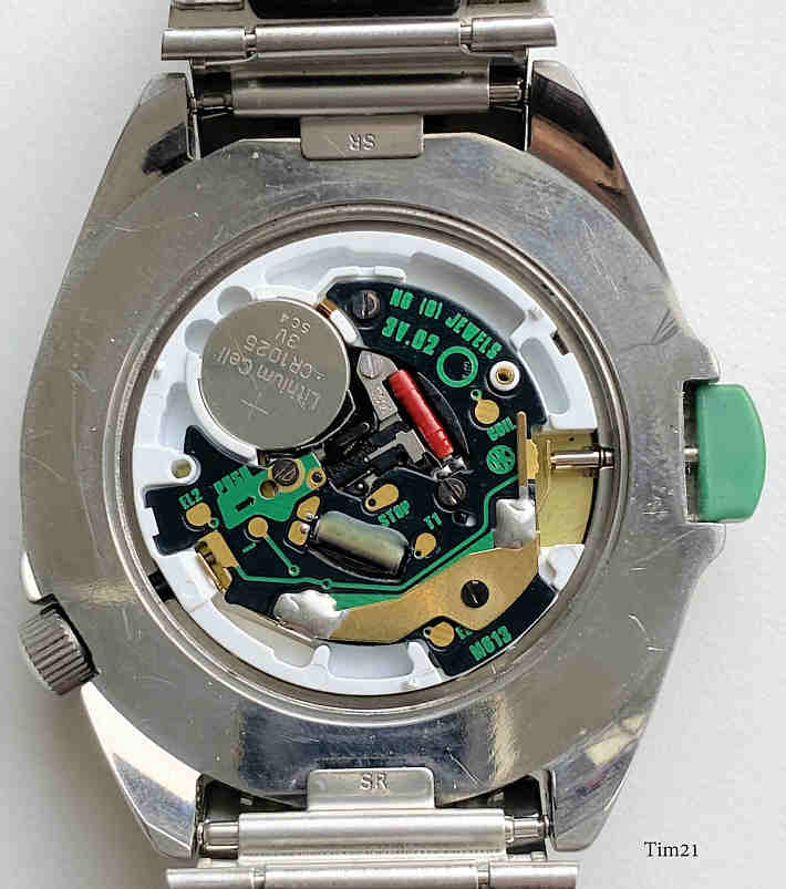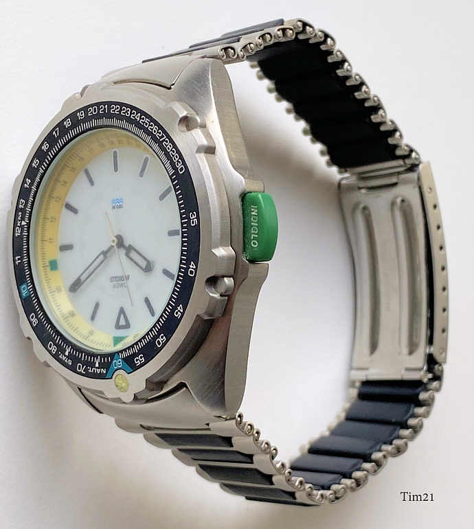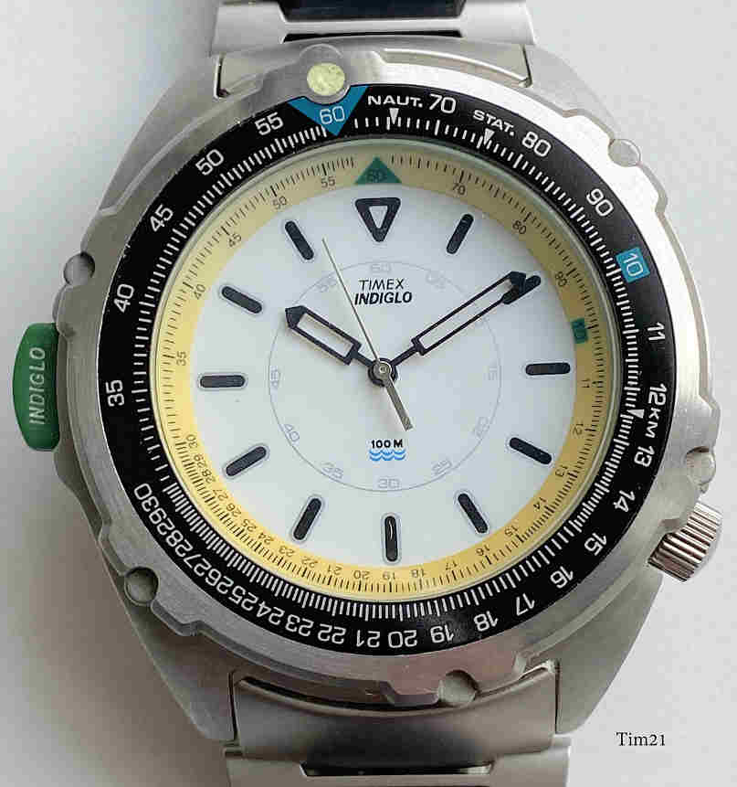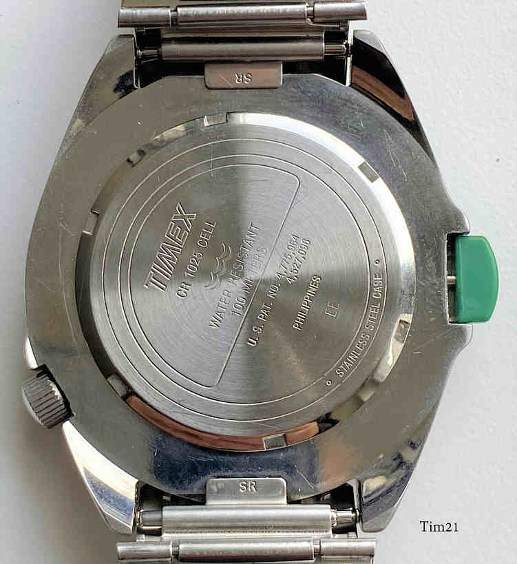 Dies ist eine Timex Indiglo Uhr im Taucherdesign. Beschriftet: ”Timex, Indiglo, 100m”. Auf der Rückseite: ”Timex, CR1025 Cell, Water Resistant 100 Meters, US Pat. No. 4.775.964, 4.527.096, Phillipines, DE, Stainless Steel Case, EE”. Innen: ”No (0) Jewels , 3V. 02, M613”. Verschraubte Krone, bei Druck auf den grünen “Indiglo” Knopf leuchtet das ganze Zifferblatt grün auf und ist damit im Dunkeln sehr gut abzulesen.