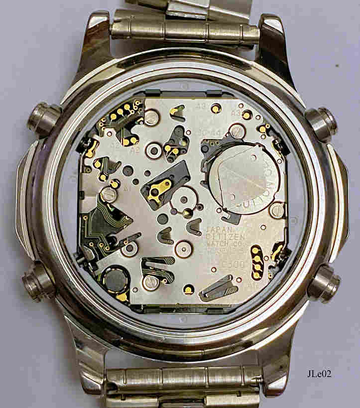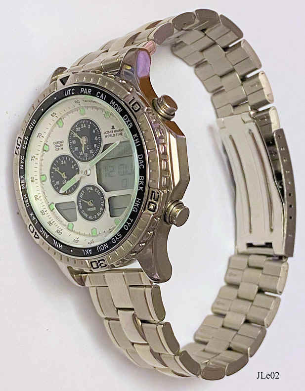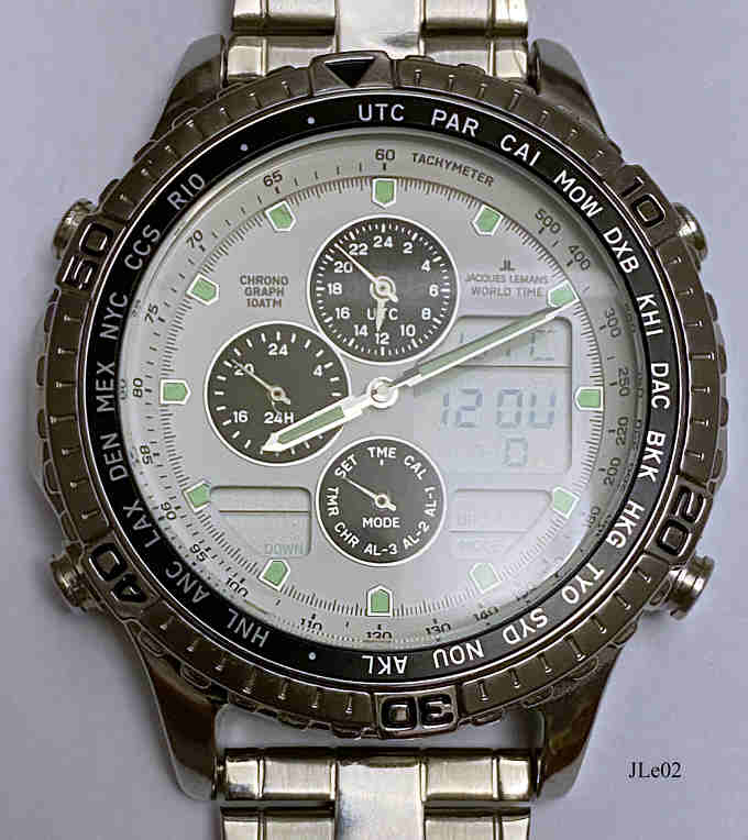 A Jacques Lemans World Timer Chronograph with white dial and stainless steel case. Functions: shows UTC and the time for 30 cities of the world, shows the calendar for 30 cities of the world, three alarms, chronograph shows 1/100 seconds, Count down timer for 60 minutes, Analog and LCD Display. Signed front: “Chronograph, 10 ATM, Jacques Lemans World Timer”, back: “All Stainless Steel, Water Resistant 10 ATM, JL 601”, inside: “Japan, Citizen Watch Co., No Jewels, C300”. Movement Citizen C300, as in Citizen Navyhawk