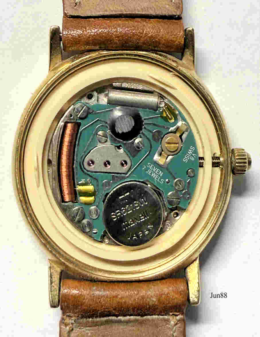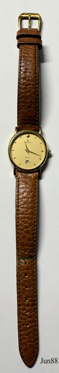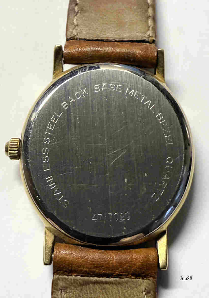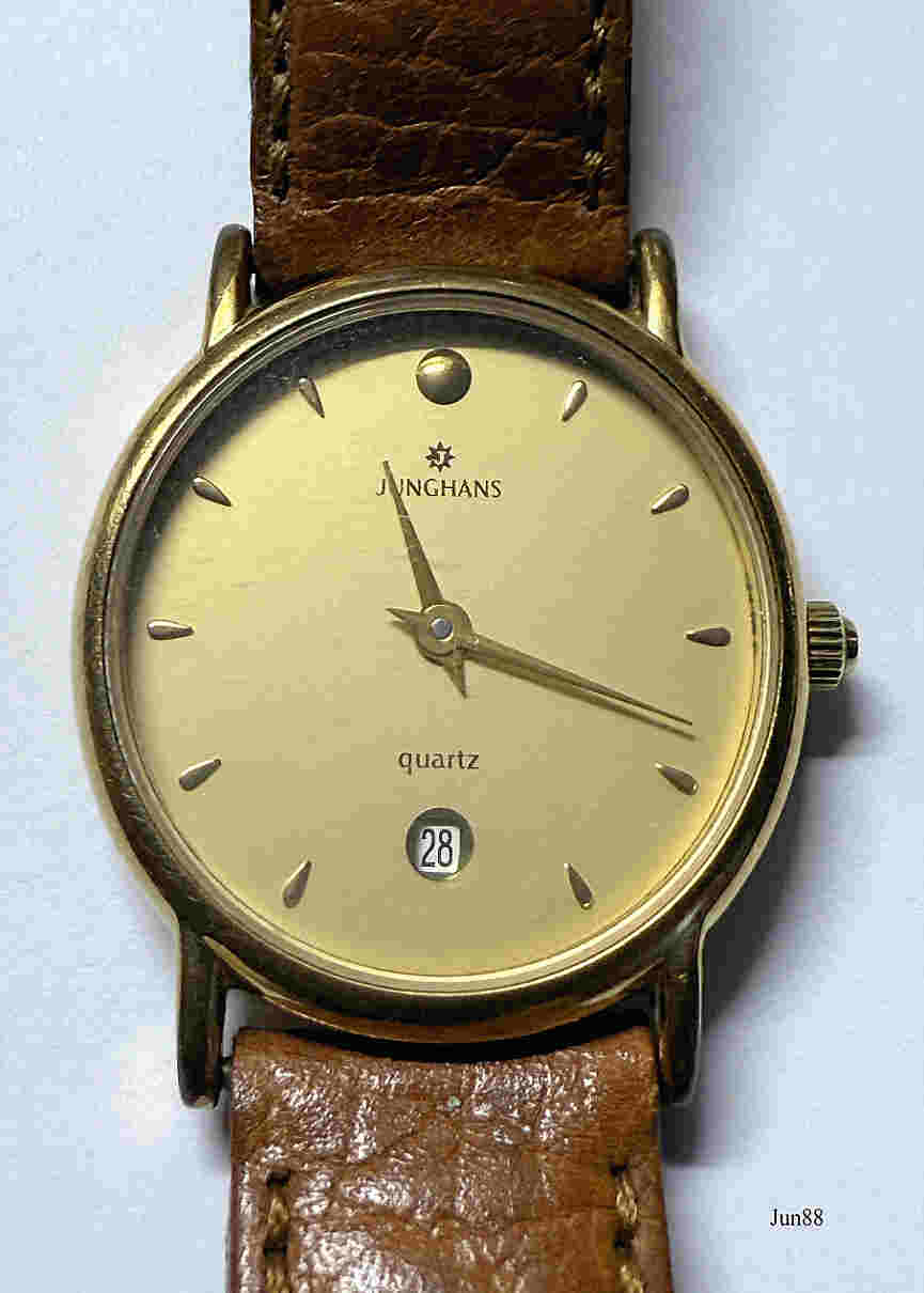 A Junghans Quartz ladies watch in a gold plated base metal case, calendar at 6. Caliber ETA 956.114. Signed front: “JUNGHANS, Quartz”€¯, back : ”Base Metal Bezel, Stainless Steel Back, Quartz, 47/7029”€¯, innen: “677. 7 Jewels, V8 Swiss, 956.114”. Brown leather band