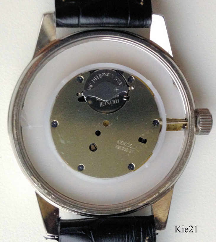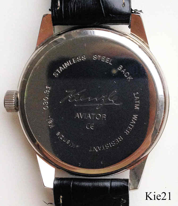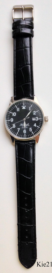 Dies ist eine Armbanduhr von Kienzle im Pilotendesign.Kalender bei der 3. Beschriftet vorn: ”Kienzle, Aviator”, Rückseite: ”Stainless Steel Back,1 ATM Water Resistant, Kienzle Kal.030.31”, innen: “Kienzle, Kal 030.31”. Gehäuse Base Metall verchromt, Schwarzes Lederarmband.