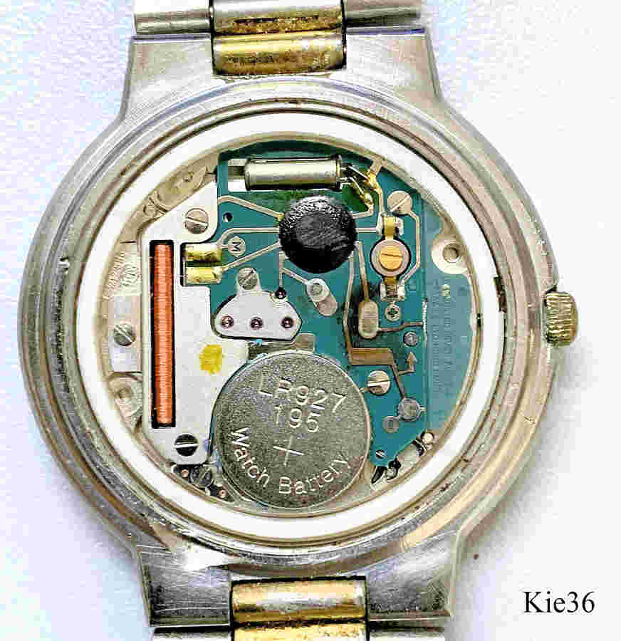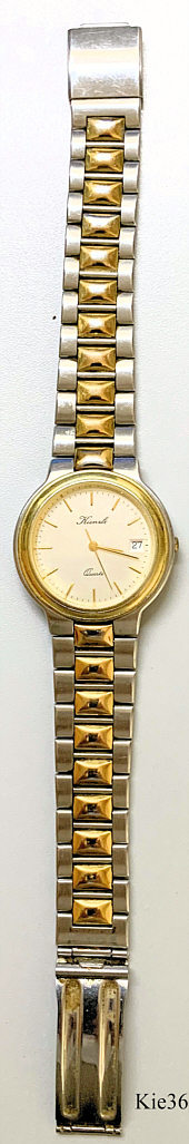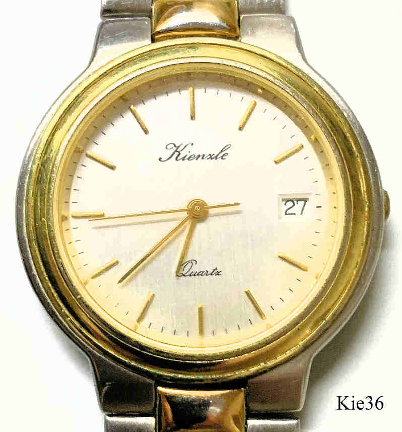 Dies ist eine Quartz Armbanduhr von Kienzle. Das Zifferblatt ist silberfarben, Kalender bei der 3. Beschriftet vorn: ”Kienzle, Quartz”, Rückseite: ”Kienzle, 1022, Stainless Steel, 3 ATM Water Resistant”. Gehäuse zweifarbig, Durchmesser 34 mm, bicolor Metallarmband. Kaliber ETA 955.414