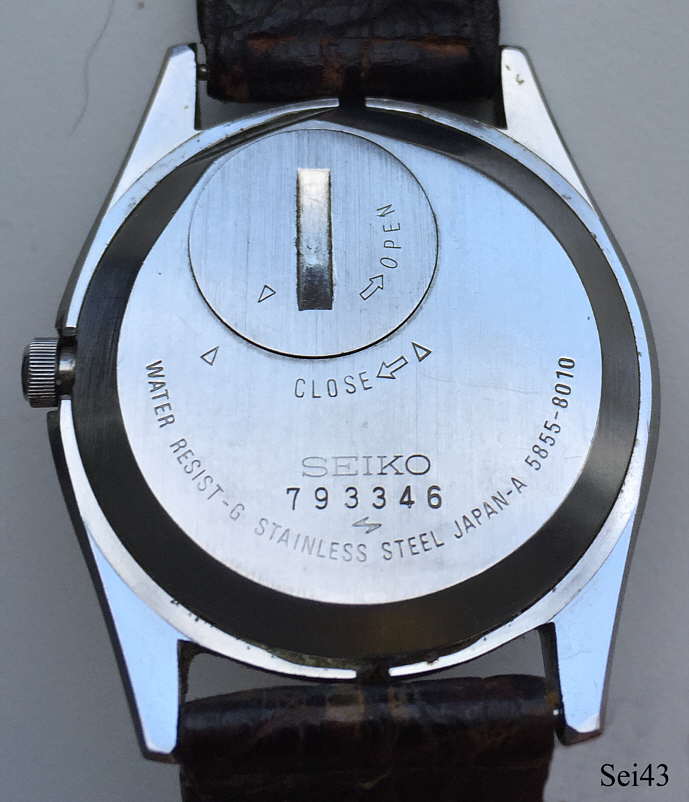 A Seiko King Quartz mans watch with a white dial. Date at 3, signed front: ”€ Seiko, King Quartz, Japan, 5855-8010S”, back: ”Seiko, Water Resist, Stainless Steel, Japan-A, 5855-8010” with brown leather band. The series King Quartz belongs below of the Grand Quartz to the upper class Seiko watches in Japan Caliber 5855-8010, a twin quartz caliber.