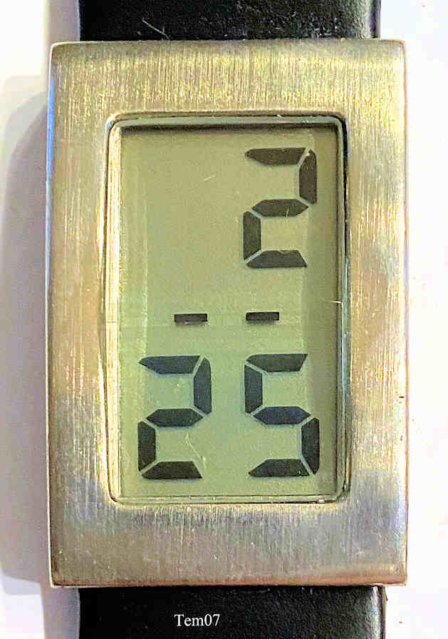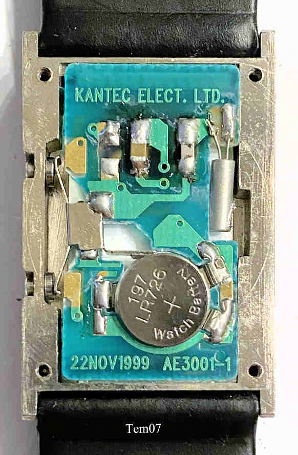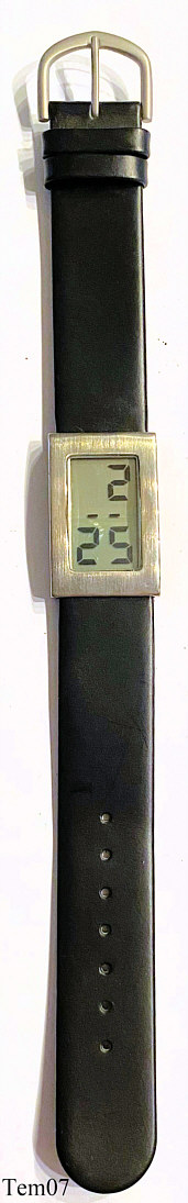 This is a ladies wood watch from Tempic with a wooden dial. Signed front: “Tempic, Quartz”, back: ”Stainless Steel Back, Tempic, Zuverlässig wie die Zeit, Art. Nr.: 856/515, Batt.: V362, CE”, inside: ”Kantec Elect. LTD, 22.Nov.1999, AE3001-1”, Black Leather Band.