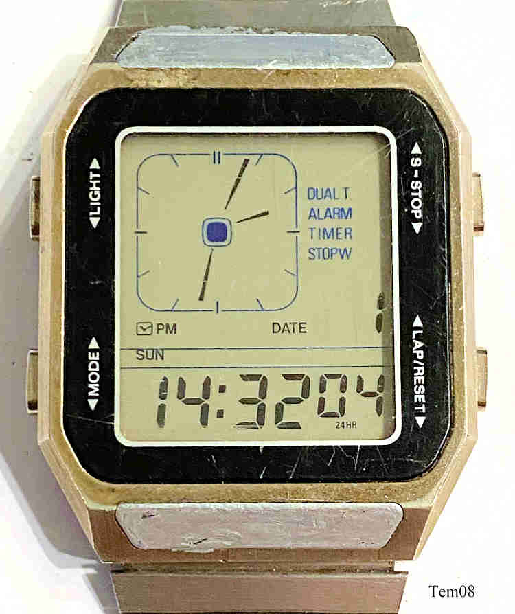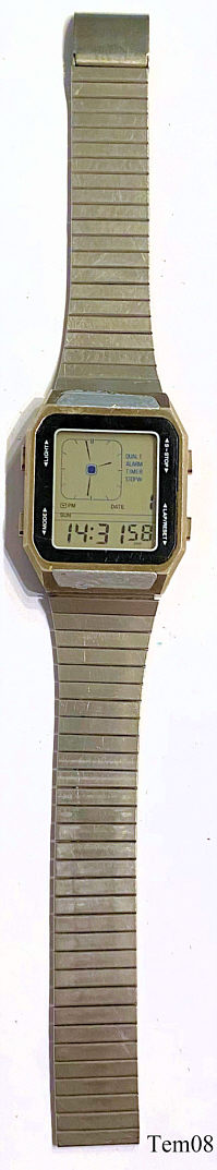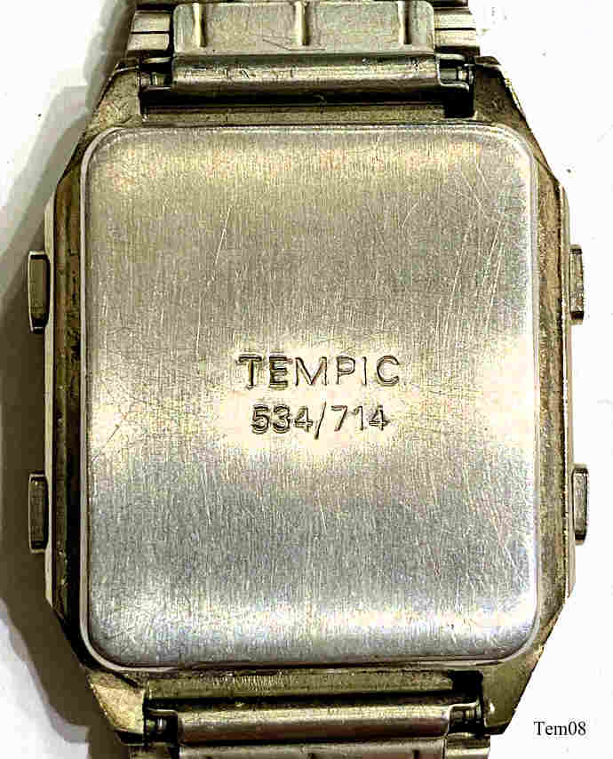 This is a modern LCDwatch from Tempic with Analog- and Digital display. Signed front: “ ”, back: ”Tempic, 534/714”, inside: ”Unadjusted, No 0 Jewels, National Electronics, R Watch Co. LTD”