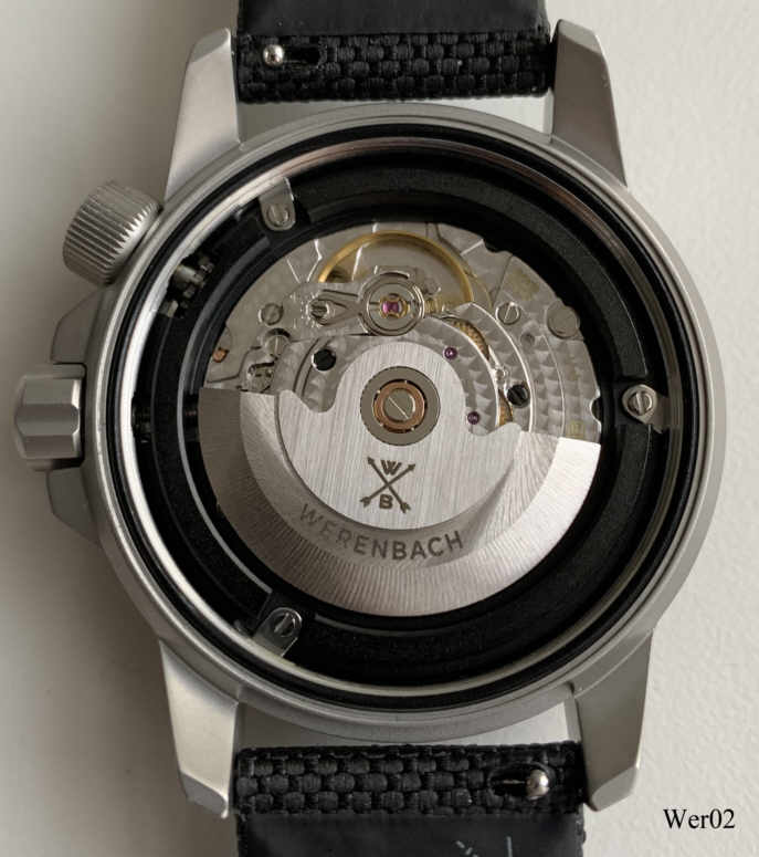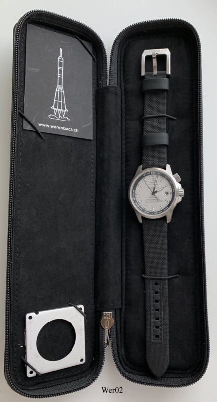 This is a Werenbach Automatic watch, Series Leonov Model SN M2 059 2018. The complete dial consists of Aluminum from a Booster of the Sojus Rocket that started on the 06.06.2018 with “Astro Alex” Alexander Gerst, Sergey Prokopyev and Serena M. Aunón-Chancellor to the ISS. The Material reached an altitude of 46 Km before it was ejected. The upper crown turns the Launch Sequencer Ring, where some Phases of the Flight are marked. ront: “Werenbach, Spaceborn, Soyuz Booster Shell, 45°38` N, 63°19’E, Launch Sequencer, Stage I Booster Cutoff, Stage II Central Block Separation, Stage III Spacecraft Separation, Soyuz Mat.”, backn: “Manned Space Mission to ISS, Soyuz Ms-09, 3 ATM, M2 059 2018”. Movement Caliber STP 1-11. The square metal parts are front and back of the original rocket piece of material from which the dial has been manufactured. |