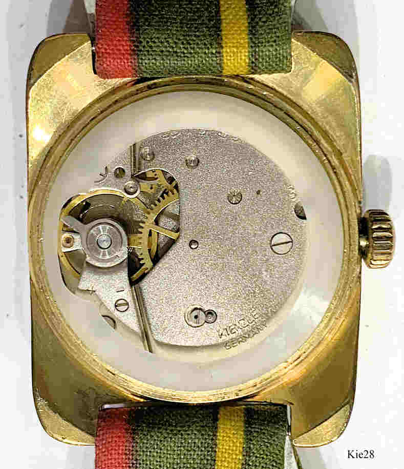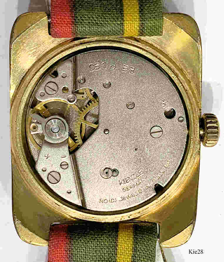 Dies ist eine Kienzle Life Damenuhr mit Handaufzugs Kaliber und Messing Gehäuse. Das Kaliber ist wohl 051 d 53. Beschriftet vorn: ”Kienzle Life, Antimagnetic”, hinten: “Stainless Steel Back, Waterprotected, Antimagnetic”, innen: ”Kienzle, Germany, No (0) Jewels, unadjusted, tw, 051d53”.