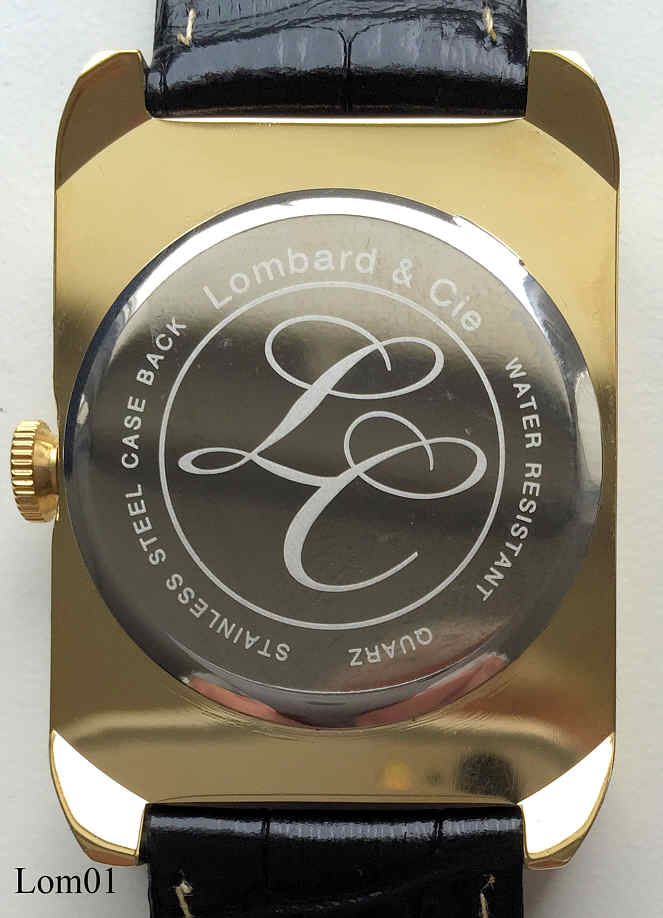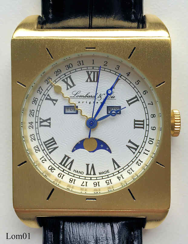 A beautiful dresswatch of Lombard&Cie with Kalendar and Moonphase,The windows at 10 show the day, at 2 shows the month and the golden pointer shows the date, the moonphase is displayed at 6. Golden base Metal case. Signed front: “Lombard&Cie, Original, Hand Made”, inside:”6P80, Miyota Co., No Jewels”, back: “Lombard&Cie, Water Resistant, Quartz, Stainless Steel Case Back”. Movement Caliber Miyota 6P80. Black leather band