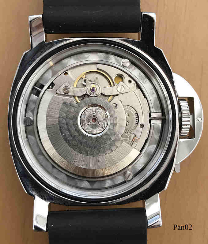 This Parnis Marina Militare Automatic watch is a true heavyweight in the Panerai design. Black dial with luminous numbers, loupe at 3 for the date. Two additional eyes, the seconds and the power reserve display. Inside is a normal automatic movement of unknown manufacture. Signed front: “Marina Militare”, back: “Marina Militare, Stainless Steel, 30 M, Automatic, Water Resistant”. Big black rubber band.
